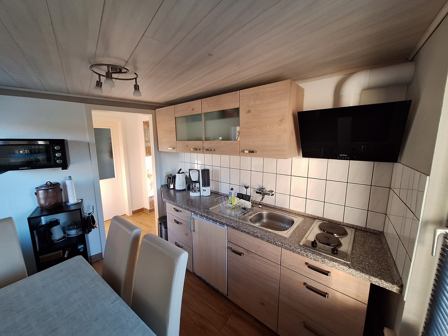 Die Küche ist mit allem ausgestattet, was in eine Küche gehört. Dazu gehören Geschirr, Besteck, Töpfe, Herd, Mini-Backofen und Kühlschtrank. Am Küchentisch können 4 Personen Platz nehmen.